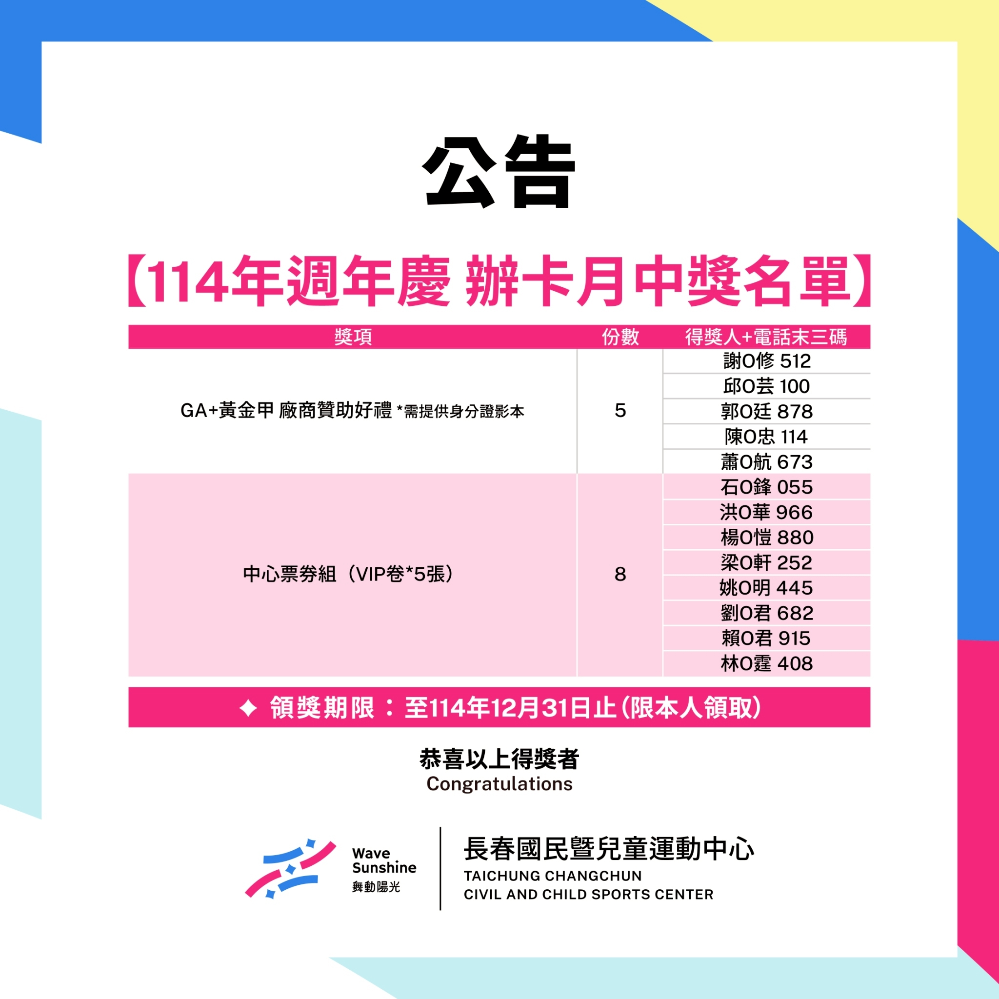 請記得 12/31 前 到中心櫃台領獎,並攜帶身分證件方便完成簽領喔!