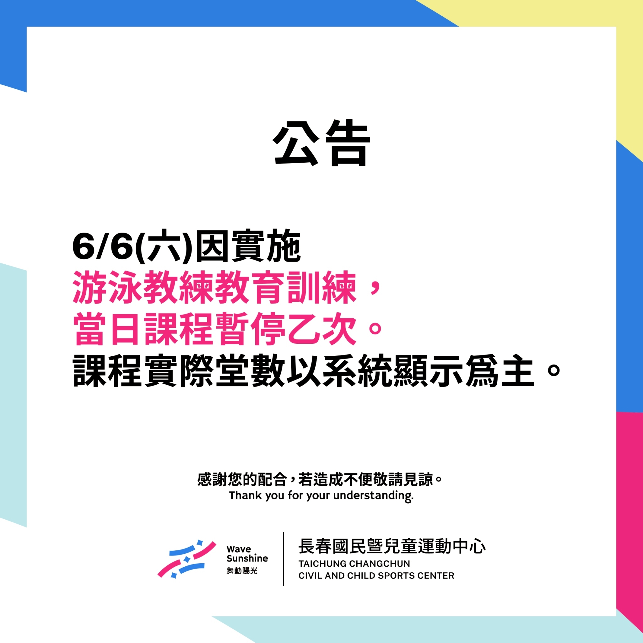 因配合游泳教育訓練,當日游泳相關課程將暫停一次